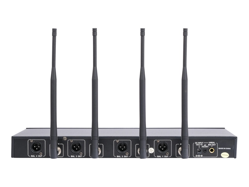 4-канальная беспроводная микрофонная система состоит из 4 наборов независимых модулей УВЧ-приемников с частотами 478-638 МГц.