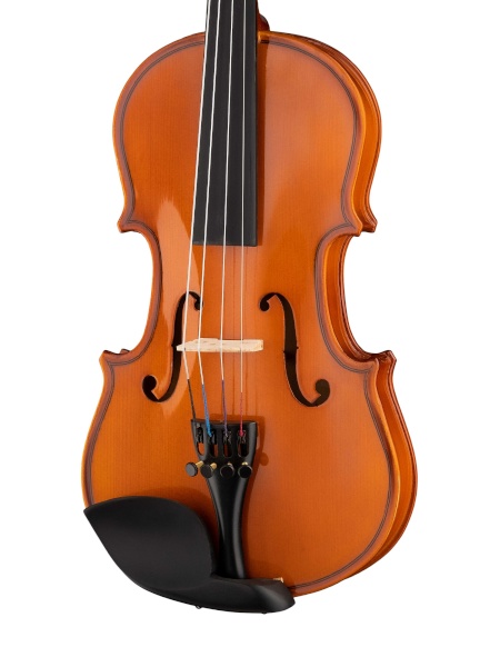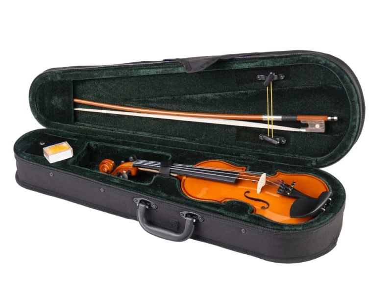 Скрипка ученическая в комплекте, верхняя и нижняя деки из ламината, гриф из клена, накладка грифа - ююба, смычок, канифоль и жесткий футляр в комплекте.