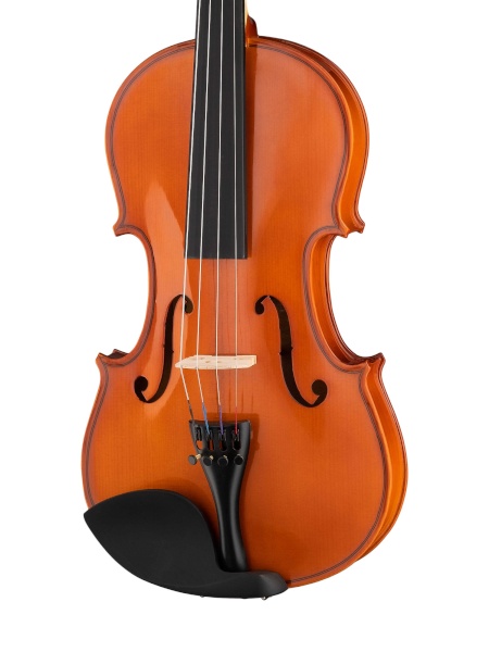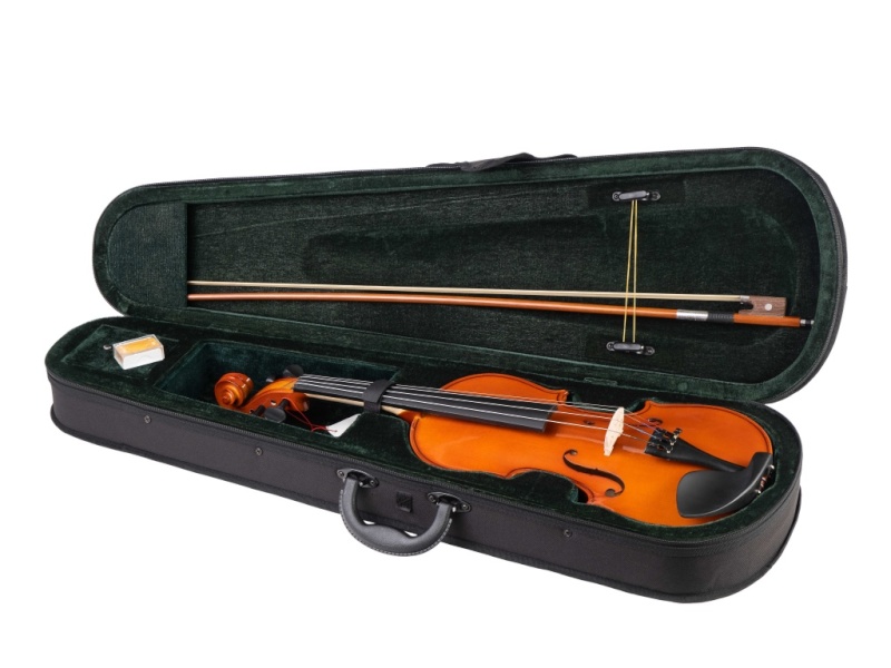 Скрипка ученическая в комплекте, верхняя и нижняя деки из ламината, гриф из клена, накладка грифа - ююба, смычок, канифоль и жесткий футляр в комплекте.