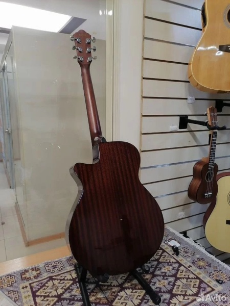 Верхняя дека инструмента выполнена из волнистого клена, задняя дека и обечайка - из сапеле.