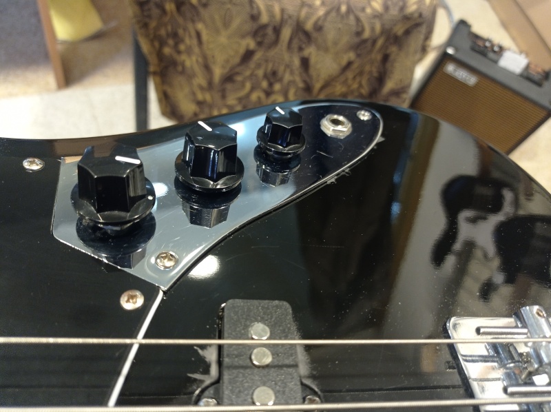 На басу установлен бридж JB Classic, два классических звукоснимателя JB, два регулятора громкости и один регулятор тона. На басу установлена никелированная колковая механика. Цвет инструмента черный.