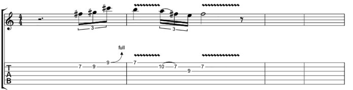 Во второй форме минорной пентатоники вы можете добавить мажорную терцию, чтобы придать ей интересную текстуру. ВВ часто начинал этот тип аккордов в миноре, прежде чем перейти к мажорной ноте и выйти из нее, а затем снова заканчивал минором. Воспринимайте постоянную смену мажорной и минорной терций как ритмический рисунок. Здесь она представлена в виде ровных 16-ти нот, но вы можете сыграть ее с небольшим колебанием, чтобы по-настоящему передать атмосферу ВВ.