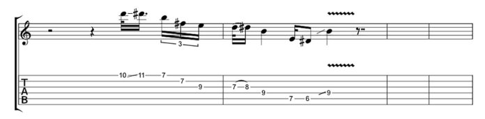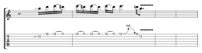 Мелодия начинается с перехода от минорной терции к мажорной на высокой струне Ми, а затем переходит в мажорную пентатонику. Здесь есть несколько мажорных нот в нисходящем порядке. 8-й лад Соль и 6-й лад Ля являются мажорными терциями.