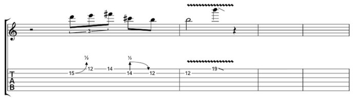 Аккорд начинается с полшага на минорной ноте, затем полшага переходит в мажорную ноту. Аккорд заканчивается другим фирменным аккордом BB. Сыграйте основную ноту песни на струне Ми на высоком уровне и извлеките ее. BB часто вставляет эти ноты в середину других нот. Попробуйте сыграть эту высокую основную ноту несколько раз, прежде чем извлекать, чтобы по-другому использовать фирменный стиль BB.