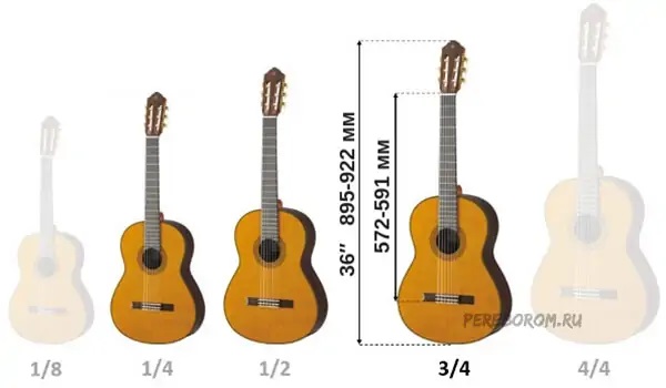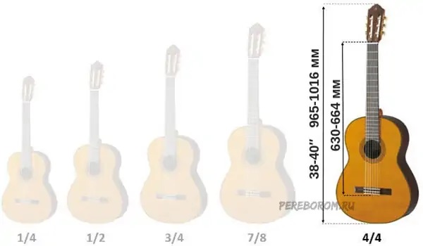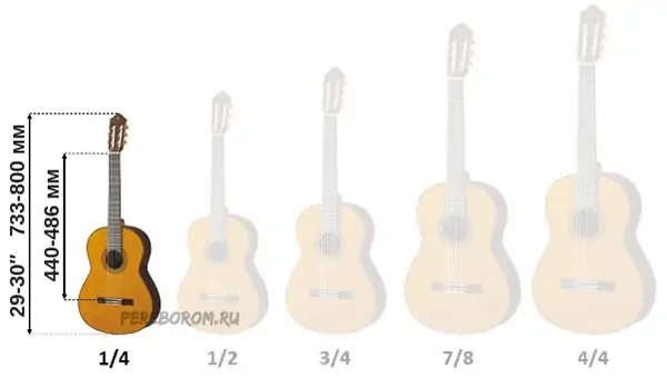 Размеры классической гитары подразделяются на четыре основных. Остальные – это уже переходные. Одна четвёртая – пожалуй, самый крошечный size, который подойдёт