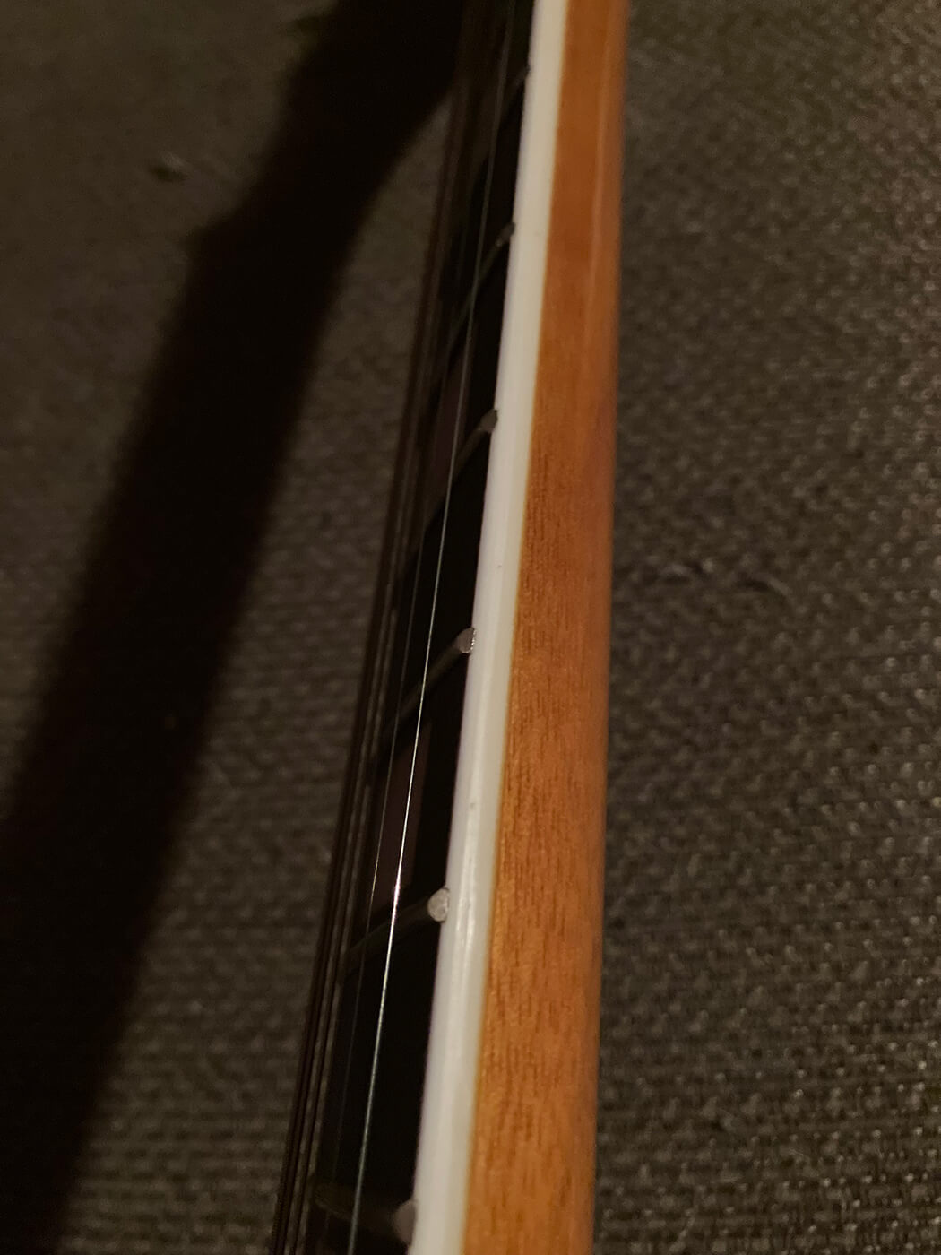 Двигаясь вниз по грифу, следующее, на что я обращаю внимание, - это кончики ладов. На Gibson вы обычно увидите, что окантовка грифа поднимается, закрывая конец лада. Это очень маленькая деталь, но именно такие мелочи делают настоящий Gibson качественным продуктом. Если на гитаре, которую вы хотите купить, отсутствуют эти накладки на лады, это верный признак того, что что-то не так.