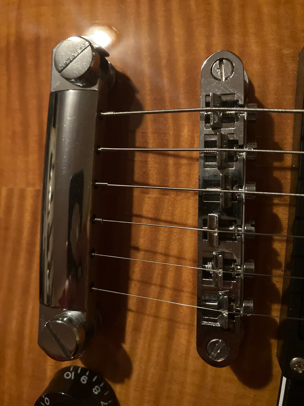Переходя к бриджу гитары, можно заметить, что копии часто имеют имитацию бриджей в стиле ABR-1, у которых на стойках установлены регуляторы с помощью плоских отверток (обратите внимание, что здесь мы говорим о бриджах, а не о хвостовике - у настоящего Gibson будет большое углубление с плоской головкой для регулировки).